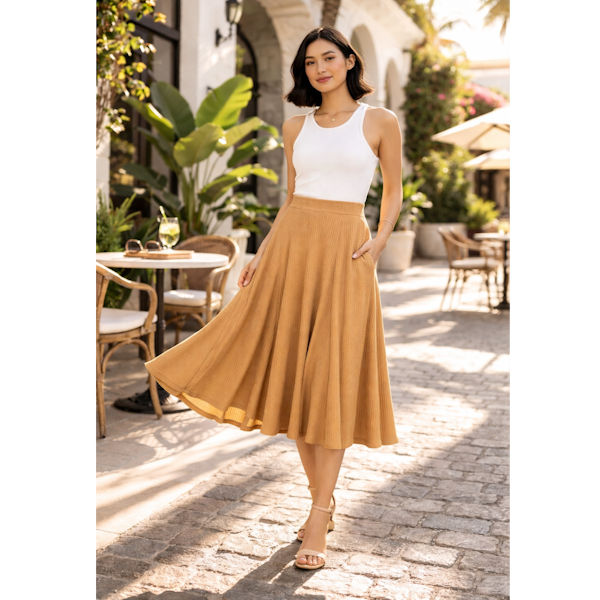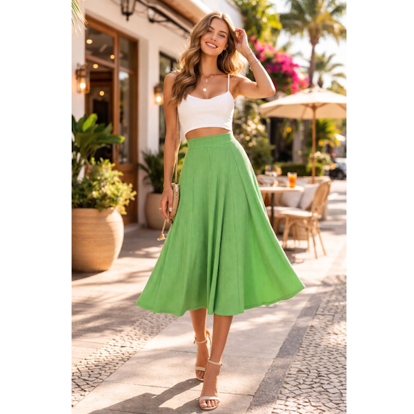 Elegância e versatilidade em uma peça que valoriza o visual feminino. A saia midi canelada com recortes é perfeita para quem busca um look moderno, confortável e cheio de estilo.