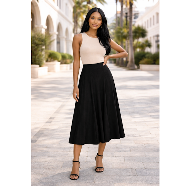 Elegância e conforto em uma peça versátil! A saia midi canelada com recortes valoriza a silhueta e traz um toque moderno ao look. Perfeita para composições do casual ao elegante.
