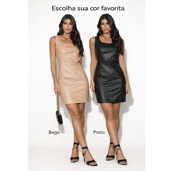 O Vestido em couro ecológico possui modelagem ajustada que valoriza a silhueta, com costuras estratégicas que garantem um caimento impecável. Seu decote quadrado moderno traz um toque elegante e atual, enquanto o comprimento acima do joelho deixa o look sofisticado e versátil.